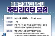 정안뉴스 안정주 기자 | 서울 은평구는 여성친화도시 조성을 위해 함께 할 ‘여성친화도시 주민리더단’ 단원을 새로 모집한다고 밝혔다. 모집 기간은 31일까지로, 온라인 또는 방문 접수가 가능하며 은평구에 거주하거나 직장을 둔 주민 중 주민리더단 활동에 적극적으로 참여할 수 있는 자는 누구나 지원할 수 있다. 신청 방법은 구 블로그나 누리집 고시·공고에서 지원신청서 등 필요 서류를 작성해 이메일 또는 은평구청 가족정책과에 방문해 제출하면 되고, 서류심사를 통해 2026년 1월 중 최종 선발 여부가 결정될 예정이다. 선발된 주민리더단은 여성친화도시 관련한 각종 사업과 성인지 교육에 참여하며 여성안심귀갓길 안전점검, 개방화장실 불법촬영 점검, 홍보물‧행사 성인지 모니터링 등 지역사회 성평등 실현을 위한 활동을 수행하게 된다. 임기는 2년이다. 김미경 은평구청장은 “우리 구는 2016년 여성친화도시로 지정된 후, 주민리더단의 적극적인 활동과 노력으로 여성의 사회 참여 확대와 성평등 의식이 지속적으로 개선됐다”라며 “앞으로도 남녀 모두가 평등하게 존중받는 은평을 만들기 위해 최선을 다하겠다”고 말했다.