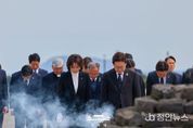 정안뉴스 안정주 기자 | 이재명 대통령과 김혜경 여사는29일 오전, 제주 4·3 평화공원을 찾아 영령들께 참배하고 유족들과 함께하는 시간을 가졌다. 이번 방문은 국가기념일인 ‘제주 4·3 희생자 추념일’을 앞두고 이루어진 것으로, 이 대통령 내외는 헌화와 분향을 통해 희생자들의 넋을 기렸다. 이어 이 대통령 내외는 희생자 15,126위의 위패가 모셔진 ‘위패봉안실’과 4·3 당시 행방불명되어 시신조차 찾지 못한 희생자들의 표석이 설치된 ‘행방불명인 표석’을 찾아 희생자들을 추모했다. 이 대통령은 위패봉안실에서 나와 방명록에 ‘제주 4·3을 기억하며 국가폭력의 재발을 막기 위해, 민형사 시효제도를 폐기하겠습니다.“라고 남겼다. 이 대통령이 방명록을 작성하는 모습을 지켜보던 임문철 제주4·3평화재단 이사장을 비롯한 관계자들은 문구를 보고 박수로 호응했다. 참배 이후 이 대통령 내외는 제주 4·3 희생자 유족들과 오찬을 함께하며 아픔을 나누고 위로하는 시간을 가졌다. 오찬 간담회에는 윤호중 행정안전부 장관과 오영훈 제주도지사, 김한규·문대림·위성곤 국회의원을 비롯해