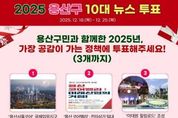 정안뉴스 안정주 기자 | 서울 용산구가 구민이 직접 올해 가장 의미 있었던 정책을 선정하는 ‘2025 용산구 10대 뉴스’ 온라인 투표를 진행한다. 주민 투표를 통해 정책 성과를 돌아보고, 구정에 대한 관심과 공감을 높이겠다는 취지다. 이번 투표에는 총 25개 주요 정책 사업이 후보로 올랐다. 참여 주민은 이 가운데 3개 사업을 선택하면 되며, 득표수를 합산해 상위 10개 사업을 ‘2025 용산구 10대 뉴스’로 최종 선정한다. 투표 결과는 12월 29일 용산구 누리집을 통해 발표될 예정이다. 후보 정책에는 용산의 중·장기 미래 경쟁력을 좌우할 대형 사업부터 주민 일상과 밀접한 생활 정책까지 폭넓게 포함됐다. 용산국제업무지구 도시개발사업인 ‘용산서울코어’와 전자상가 일대를 AI·ICT 콘텐츠 중심의 신산업 거점으로 육성하는 ‘용산 코어밸리’가 대표적이다. 이태원전망대에서 녹사평광장, 구청사 힐링정원으로 이어지는 ‘이태원 힐링로드’ 조성 사업 역시 도심 속 휴식 공간을 조성하는 주요 정책으로 포함됐다. 경제·교육 분야에서는 △취업박람회 기술인력 양성 등 청년·중장년 취·창업 지원 확대 △골목상권 공동체 및 전통시