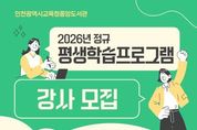 정안뉴스 안정주 기자 | 인천광역시교육청중앙도서관은 지역 주민에게 다양한 학습 기회를 제공하기 위해 ‘2026년 평생학습프로그램’ 강사를 공개 모집한다. 2026년 정규 평생학습프로그램은 상반기(3~5월)와 하반기(9~11월)로 나뉘어 각각 8회씩 운영되며, 모집 분야는 유아 대상 독후활동, 초등 1~2학년 대상 초등 영어, 성인 대상 AI 활용과 동영상 제작, 우쿨렐레, 금융·경제 등 총 5개 분야다. 서류 접수는 12월 23일부터 29일 오후 5시까지이며, 중앙도서관 누리집 공지사항에서 제출 서식을 내려받아 작성한 뒤 관련 서류와 함께 이메일로 제출하면 된다. 강사는 1차 서류심사와 2차 면접심사를 거쳐 최종 선정된다. 자세한 사항은 중앙도서관 누리집에서 확인할 수 있으며, 문의는 마을교육지원과로 하면 된다.