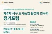 정안뉴스 안정주 기자 | 인천 서구의회 《서구 도시농업 활성화 연구회》는 14일 오후 2시, 서구청 대회의장에서 제4차 정기포럼을 개최한다. 이번 정기포럼 주제는‘도시 속에 심는 마음, 치유와 회복으로 함께 자라는 우리’로 발제는 서울대학교 이성우 책임연구원이 맡는다. 그동안 연구단체는 치유와 힐링의 도시농업 연구에 따른 자연친화, 환경회복 도시환경 조성을 주제로 연구 활동을 지속해 왔다. 전국 우수사례 현장 견학 13회와 정책 연구용역 2건을 진행했고, 포럼과 세미나를 3차례 개최했다. 이번 보고회는 그간의 왕성한 활동을 통해 얻어진 연구 성과의 최종 발표로 도시농업에 관심이 많은 구민들의 기대를 모으고 있다. 특히 이번 행사는 부대 프로그램도 함께 열려 더욱 풍성하다. ‘도시농업으로 만드는 치유와 회복의 여정’ 연구활동 성과와 참여 기관의 치유농업 성공 사례 성과물도 함께 전시한다. 이번 정기포럼에 대해 김남원 대표 의원은 “3년 동안의 단일 주제로 연구 활동을 해왔다”, “2023년 처음 활동 당시 의원님 그대로 열과 성의를 다해 동참해 주신 결과의 산물이