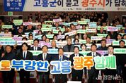 정안뉴스 안정주 기자 | 광주광역시는 12일 전남 고흥문화회관에서 ‘광주전남 행정통합 고흥군 상생토크’를 열고, 고흥군 발전 전략과 통합 이후 변화상에 대해 고흥군민들과 소통했다. 이번 행사는 여섯번째 열린 상생토크로, 통합 이후 고흥의 우주·해양·농어촌 자원을 활용해 광주·전남 균형발전을 이루기 위해 마련했다. 이날 행사에는 강기정 광주시장을 비롯해 공영민 고흥군수, 류제동 고흥군의회 의장, 고흥군민 등 600여 명이 참석해 광주전남 통합에 대한 높은 관심을 보였다. 강기정 시장은 먼저 광주전남 통합 추진상황과 향후 일정, 통합에 대한 정부 특전(인센티브) 등을 설명하며 통합 의지를 밝혔다. 강 시장은 이어 고흥군과 관련된 특별법안 특례조항으로 ▲광역생활권 지정과 교통복지 ▲항공우주 산업 육성 ▲문화관광 기반시설(인프라) 구축 지원 등을 소개했다. 특히 고흥을 비롯한 위기산업지역인 전남 동부권에 재정을 우선적으로 투입해 일자리를 지키고 광주·전남 균형발전을 이끌겠다는 구상을 발표했다. 이날 상생토크에서 공영민 고흥군수는 ▲안정적인 농어촌 재정 지원 ▲우주항공산업 육성 ▲광
