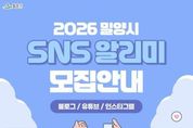정안뉴스 김재홍 기자 | 경남 밀양시는 오는 12일 1일까지 시의 정책, 문화·관광, 축제·행사, 맛집 등 다양한 분야를 취재하고 홍보할 ‘2026년 사회관계망서비스(SNS) 알리미’를 모집한다고 24일 밝혔다. 모집 분야는 블로그 10명, 유튜브 5명, 인스타그램 5명 등 총 20명이다. 2026년에는 인스타그램 부문을 새롭게 신설해 더 다양한 플랫폼에서 밀양의 매력을 알리고자 한다. 선발된 SNS 알리미는 내년 연말까지 밀양시의 숨겨진 볼거리, 즐길 거리, 먹거리 등을 발굴해 품질 높은 콘텐츠를 제작하고, 이를 시 공식 사회관계망서비스 채널에 공유하게 된다. 활동자에게는 매월 콘텐츠 제작에 따른 소정의 원고료가 지급되며, 시가 주최하는 행사에 우선 참여하고 취재할 수 있는 기회 등 다양한 혜택도 주어진다. 지원 방법은 밀양시 대표 누리집의 고시·공고란에서 지원서를 내려받아 작성 후 이메일로 제출하면 된다. 모집 관련 자세한 사항은 밀양시 대표 누리집 또는 공식 사회관계망서비스에서 확인할 수 있다. SNS 알리미 선정 결과는 12월 12일 밀양시 대표 누리집