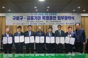 정안뉴스 안정주 기자 | 구로구가 1월 29일 구청 3층 르네상스홀에서 신한은행, 우리은행, 하나은행, 국민은행, 새마을금고, 서울신용보증재단과 ‘더 나은 내일을 위한 금융동행’ 특별출연 협약을 체결하고, 총 212억 5천만 원 규모의 중소기업·소상공인 특례보증을 추진한다. 이번 협약은 자금 조달에 어려움을 겪는 지역 내 기업들의 금융 접근성을 높이기 위한 것으로, 구로구와 5개 금융기관이 공동으로 출연한 재원을 바탕으로 서울신용보증재단이 보증을 지원하는 방식이다. 협약에 따라 총 22억 원의 출연금이 조성됐다. 출연 비율은 구로구 2억 원, 신한은행 8억 원, 우리은행 4억 원, 하나은행·국민은행 각 3억 원, 새마을금고 2억 원이다. 서울신용보증재단은 이를 기반으로 보증한도 212억 5천만 원의 특례보증을 시행한다. 특히 신한은행 출연금 가운데 5억 원은 담보력이 부족한 중소기업과 소상공인을 위한 특별보증 재원으로 별도 활용될 예정이다. 융자 한도는 중소기업 최대 1억 원, 소상공인 최대 5천만 원이며, 구로구에 사업장을 두고 사업자등록이 되어있는 경우 신청할 수 있다. 대출 조건은 1년 거치