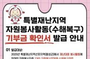 정안뉴스 황도연 기자 | 홍성군자원봉사센터는 지난해 군에 기록적인 폭우가 내리며 특별재난지역으로 선포됨에 따라, 수해복구 현장에서 자원봉사활동에 참여한 자원봉사자를 대상으로 ‘특별재난지역 자원봉사용역 등에 대한 기부금 확인서’를 발급한다고 밝혔다. 이번 기부금 확인서는 특별재난지역 수해복구에 참여한 자원봉사자의 봉사활동을 사회적으로 인정하고, 연말정산 및 종합소득세 신고 시 소득공제 혜택을 받을 수 있도록 지원하기 위한 것이다. 발급 대상은 2025년 홍성군 수해복구 자원봉사활동에 참여하고, 1365자원봉사포털에 수해복구 관련 봉사시간이 입력된 자원봉사자이며, 신청은 내달 13일까지이다. 신청을 희망하는 자원봉사자는 홍성군자원봉사센터 공지사항을 참고하여 기부금 확인서 서식을 내려받아 파란색 표시된 항목을 작성한 후, 기관 이메일(cnvc14@v1365.or.kr)로 제출하면 되고, 방문 접수를 희망할 시 센터로 직접 방문하거나, 가까운 읍·면행정복지센터에 제출하면 된다. 발급된 기부금 확인서는 연말정산 시 소득공제 항목에 기재하여 증빙자료로 제출하거나, 종합소득세 신고 시 활용할 수 있다. 기부금
