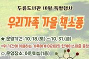정안뉴스 안정주 기자 | 대구두류도서관은 10월 18일부터 31일까지 어린이실에서 선착순 40가족을 대상으로 책과 소풍 물품을 함께 대여하면 머리띠와 퍼즐을 증정하는‘우리가족 가을 책소풍’행사를 실시한다. 참여를 원하는 가족은 어린이실에 방문하여 도서관 회원증을 제시하고 책과 돗자리, 간이의자, 미니테이블, 독후활동지, 보드게임 등 소풍에 필요한 물품을 대여하고 당일 오후 5시까지 반납하면 된다. 기타 자세한 내용은 도서관 누리집 또는 어린이실로 문의하면 된다.