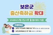 정안뉴스 황은경 기자 | 충북 보은군은 저출생 극복과 출산·양육 가정의 경제적 부담 완화를 위해 2026년부터 출산축하금 지원을 확대 시행한다고 밝혔다. 그동안 군은 2025년까지 자녀 수와 관계없이 출생아 1명당 출산축하금 100만 원을 지급해 왔으나, 2026년부터는 자녀 수에 따라 지원 금액을 차등 지급하는 방식으로 제도를 개선해 양육 가정에 실질적인 도움이 되도록 했다. 지원 대상은 2026년 1월 1일 이후 출생아로, 첫째는 200만 원, 둘째 700만 원, 셋째 1,000만 원, 넷째 1,500만 원, 다섯째 이상은 2,000만 원을 지급한다. 첫째는 일시금으로 지급하며, 둘째 이상은 출생 후 4년간(0~4세) 연차별로 분할 지급하고 매년 생일이 속한 달의 다음 달 말까지 지급할 예정이다. 지원 기준은 2026년 1월 1일 이후 보은군에 출생신고 한 가정으로 보호자가 출생일 기준 6개월 이전부터 군에 주민등록을 두고 있어야 하며, 출산축하금 지원사업에 대한 자세한 사항은 건강증진과 모자보건팀으로 문의하면 된다. 홍종란 보건소장은 “출산축하금 지원 확대를 통해 출산과 양육에 대한 사회적 책
