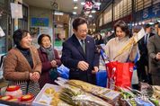 정안뉴스 안정주 기자 | 이재명 대통령과 김혜경 여사는 오늘 낮, 설 명절을 앞두고 충북 충주시에 위치한 무학시장을 찾아 지역 세밑 물가를 점검하고 상인들을 만나 현장 의견을 청취했다. 무학시장은 지난 1978년 노점상들의 정착을 위해 개설된 전통시장이며, 이번 방문은 설 민심을 청취하기 위한 민생 행보의 일환이다. 이 대통령과 김 여사는 시장 내 여러 상점을 들러 “새해 복 많이 받으세요”라며 인사를 했고, 상인과 시민들은 환호와 박수로 이 대통령 부부를 맞았다. 이 대통령 부부에게 더덕을 판매한 상인은 “덕분에 마수걸이를 한다”며 “오늘 장사가 잘될 것 같다”고 말해 웃음을 자아냈다. 다른 상인들도 “힘나게 해주셔서 감사하다”, “너무 고생 많으시다”며 인사를 전했다. 이 대통령 부부는 황태포, 시금치, 곶감과 깐밤 등 제수용품과 먹거리를 구입했고 백도라지, 마른 멸치, 배추전 등을 즉석에서 맛보기도 했다. 이 대통령 부부는 온누리상품권과 현금으로 결제했다. 김 여사가 물건을 고르는 사이 이 대통령은 상인들에게 “장사는 잘 되느냐”, “곧 설인데 어떠시냐”고 물었다. 정육점 사장은