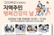 정안뉴스 황정혜 기자 | 부산 동래구는 오는 11월 15일 낮 12시부터 동래구 혁신어울림센터(동래구 금강로 129) 1층 어울림 마당에서 고신대학교와 함께 ‘지역 주민 행복 건강의 날’ 행사를 개최한다고 밝혔다. 이번 행사는 지역 주민의 건강 증진과 삶의 질 향상을 위해 마련된 것으로, 어린이부터 성인까지 전 연령층이 참여할 수 있다. 혁신어울림센터 행사장 내 각 부스는 체험 내용과 참여 인원에 따라 운영시간이 상이하며, 모든 프로그램은 현장에서 선착순 접수로 참여할 수 있다. 행사에는 고신대학교의 복음병원과 웰니스센터가 참여해 전문적인 건강 체험과 상담 프로그램을 진행한다. 주요 프로그램으로는 △신체 재활 건강 체험(인지 재활치료, 손 기능 평가) △언어·목소리·기억력 검사 △영양판정 및 상담 △기본 건강진단 △탄력밴드 운동 및 테이핑 요법 체험 △어린이 청진기 만들기 체험 등이 운영될 예정이다. 동래구 관계자는“이번 행사는 주민들이 쉽고 즐겁게 건강을 점검하고, 일상 속 건강관리 습관을 기르는 데 도움을 드리기 위해 준비했다”라며 “고신대학교와의 협력을 통해 전문성과 신뢰도를 높인