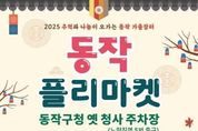 정안뉴스 안정주 기자 | 동작구가 오는 11월 1일 오전 10시부터 오후 5시까지 구청 옛 청사 주차장(노량진역 5번 출구)에서 ‘2025 추억과 나눔이 오가는 동작 가을장터’를 연다고 밝혔다. 이번 행사는 주민과 단체가 직접 참여하는 ‘플리마켓’과 김장철 맞이 ‘직거래장터’를 한자리에서 즐길 수 있도록 기획됐다. 먼저 플리마켓은 약 30개 부스에서 의류, 도서, 소품 등 다양한 중고 물품을 판매하며 일상 속 자원순환 문화를 실천하는 장으로 마련된다. 직거래장터에서는 자매결연 도시 등에서 들여온 김장철 필수 품목(배추, 무, 고춧가루 등)과 지역특산물이 시중가보다 최대 33% 저렴하게 판매된다. ▲축산물 타임세일(11시·13시·15시) ▲선착순 증정품 지급 ▲당일 배달서비스(박스 단위, 관내 한정) ▲칼갈이 부스(인당 2개, 개당 100원) 등 다양한 이벤트도 진행된다. 아울러 주민들이 즐길 수 있는 ‘체험 프로그램(한지 무드등·편백 향낭 만들기 등)’과 구청 직원이 참여하는 ‘사랑 나눔 바자회’도 운영된다. 바자회 수익금은 동작복지재단 등에 후원금으로 활용될 예정이다. 이와 함께 군고