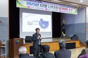 정안뉴스 황도연 기자 | (사)대한노인회 청양군지회(지회장 전석호)는 지난 24일 정산도서관 대강당에서 정산, 목, 청남, 장평 프로그램 참여자 및 관계자 등 100여 명이 참석한 가운데 ‘노인건강아카데미 종강식’을 성황리에 개최했다. 이번 사업은 어르신들을 대상으로 노인전문강사를 초청해 교양강좌와 건강 교육 프로그램을 운영, 어르신들로부터 큰 호응을 얻었다. 종강식은 1부 종강식과 2부 군수 특강 순서로 진행됐으며, 특히 김돈곤 청양군수가 ‘인생은 100세부터’라는 주제로 특강을 진행했다. 김 군수는 우리 군의 고령친화정책과 2026년 추진 예정인 복지사업에 대해 수강생들의 눈높이에 맞춰 자세히 설명하며, 어르신들의 삶의 질 향상을 위한 군의 노력을 강조했다. 김돈곤 군수는 “어르신들의 노후를 책임지는 것은 군수로서 큰 책무라 생각한다”라며 “다양한 복지시책과 여가 프로그램을 통해 어르신들이 편안한 노후 생활을 할 수 있도록 항상 최선을 다하겠다”고 말했다.