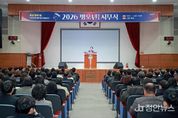 정안뉴스 김재홍 기자 | 사천시는 2일 오전 10시 시청 대강당에서 박동식 사천시장을 비롯해 김제홍 부시장, 국·소장 및 전 직원이 참석한 가운데 2026년 병오년 시무식을 개최했다. 이날 시무식은 시정 홍보영상 시청, 유공 공무원 표창 수여, 신년사 순으로 진행됐으며, 공식 행사에 앞서 2025년 혁신주니어보드 최우수팀의 이지연 주무관이 ‘MZ의 시선에서, 소소하고 확실한 혁신’을 주제로 조직문화와 일하는 방식 개선에 대한 아이디어를 제시해 시무식 분위기에 변화를 더했다. 특히, ▲글로벌 우주항공복합도시 도약 ▲머무는 해양·문화 관광도시 완성 ▲민생경제 회복 및 지역상권 보호 ▲교통·정주환경 개선과 시민 안전 강화 ▲아이부터 어르신까지 행복한 복지도시 조성 등 올해 시정 운영의 5대 중점 과제를 제시했다. 유공 공무원 표창 수여식에서는 국무총리 표창(박민경, 박현아, 배현기, 김미경)을 비롯해 행정안전부장관 표창(강영욱,하동훈), 보건복지부장관 표창(유재희) 경상남도지사 표창(조인영, 이현진, 강선미, 박예슬, 최재형, 김수지) 등 총 13명의 직원이 성실한 공직 수행의 공로를 인정받아 수상의 영예를 안았다.