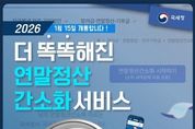 정안뉴스 안정주 기자 | 더 똑똑해진 연말정산 간소화 서비스 2026년 1월 15일 개통합니다! ■ 더~욱 새로워진 연말정산 간소화 서비스 기존 42개 자료+ 3개 자료 추가 1. 발달 재활 서비스 이용 증명 2. 장애인 활동 지원 급여 본인 부담금 자료 3. 체육시설 이용료 자료 ■ 더~욱 정교해진 소득 기준 초과 부양가족 명단 제공 소득 금액 100만 원 초과 부양가족에 대한 정보 연말정산 간소화 서비스 자료 조회 화면에서 안내 * 근로소득만 있는 경우 총급여 500만 원 - 소득 기준 초과 부양가족 내역 * 자세한 사항은 국세청 블로그를 참고해주세요! ■ AI 전화 챗봇 상담 - 국세 상담센터: ☎126→0번→0번(상담사 또는 AI 상담사 연결) - 세무서: 대표번호→2번→6번(AI 상담사 연결) (AI 상담사) · 주민등록번호 입력 후 본인인증 연말정산 간소화 자료 일괄 제공 현황, 부양가족의 간소화 자료 제공 동의 현황 등 · 생성형 AI 챗봇 상담 시범 운영 경로→홈택스 접속→홈택스 퀵메뉴→챗봇 상담 클릭 *홈택스 ■ 연말정산 유의