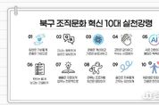 정안뉴스 안정주 기자 | 광주광역시 북구는 건강한 조직으로 체질 개선하기 위한 의지가 담긴 10대 실천강령을 선포한다고 29일 밝혔다. 10대 강령은 일하는 방식 및 경직된 조직문화 개선을 통해 행정서비스의 질적 향상을 도모하고자 마련됐다. 앞서 북구는 지난 2월 수립된 ‘2026년 북구 조직문화 혁신운동 추진계획’을 근거로 부구청장을 단장으로 하는 ‘북구 조직문화 혁신추진단’을 올해 처음 구성했다. 추진단은 ‘조직문화 혁신운동 추진계획’에 포함된 33개의 세부과제가 내실 있게 추진될 수 있도록 점검하고 신규 과제를 발굴하는 역할을 담당한다. 지난 17일에는 추진단의 심의를 통해 조직문화 개선 과정에 공직자들의 참여를 독려하기 위한 ‘10대 실천강령’을 확정했다. 강령은 ▲소통 강화 ▲스마트 행정 ▲유연한 근무 환경 조성 등 3개 중점 과제에 기반해 도출됐으며 올해 초 공직자를 대상으로 실시한 조직문화 진단 설문조사 결과를 반영해 체감도를 높였다. 북구는 다음 달 18일부터 2주간을 ‘10대 강령 집중 실천 기간’으로 정하고 실적 우수부서에는 격려금을 지급하는 등 포상할 예