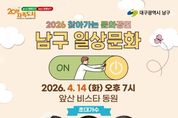 정안뉴스 안정주 기자 | 대구 남구는 지역 주민들에게 일상 속 문화 향유 기회를 확대하고, 지역 예술가들의 공연 활동을 지원하기 위해 ‘2026 찾아가는 문화공연’ 을 개최한다. 관내 신규 입주 공동주택을 대상으로 공연을 희망하는 아파트 단지를 선정하였으며, 오는 4월 14일(화) 앞산비스타동원 아파트에서 첫 공연을 진행할 예정이다. 저녁 7시에 열리는 ‘앞산비스타동원 음악회’에서는 인기 개그맨 김재롱이 사회를 맡고, 지역 가수 이새벽과 미스트롯 4 출연자 장혜리 가수가 공연을 펼친다. 또한, 아파트 입주 후 처음으로 열리는 주민 참여 행사인만큼 입주자 대표회에서도 다양한 경품과 선물을 준비하여 주민 화합의 장을 만들 예정이다. 조재구 남구청장은 “대규모 축제나 행사도 중요하지만, 주민들이 사는 가까운 동네에서 편하게 문화예술을 접할 수 있도록 찾아가는 문화행정을 적극 추진하겠다.”라며, “아파트로 찾아가는 음악회를 통해 주민들이 일상에서 소소한 행복을 느끼며 힐링할 수 있기를 바란다.”라고 전했다. ‘찾아가는 문화공연’에 대한 문의는 남구 문화관광과 문화예술팀으로 연락하면 안내받을 수 있다.