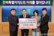 정안뉴스 안정주 기자 | 전북특별자치도는 20일 도청에서 ㈜엔라인이 운영하는 온라인 여성의류 쇼핑몰 ‘난닝구닷컴’의 의류 기탁식을 개최했다. 이날 기탁식에는 김관영 도지사와 이정민 ㈜엔라인 대표, 전북사회복지공동모금회 한명규 회장 등이 참석해 기탁 물품을 전달하고 나눔의 의미를 함께 나눴다. 이번에 기탁된 물품은 의류 2,611벌(약 1억 원 상당)로, 전북사회복지공동모금회를 통해 도내 저소득 세대와 사회복지시설 등 지원이 필요한 현장에 순차적으로 전달될 예정이다. 도는 현장 수요를 면밀히 반영해 배분 과정에서 지원 공백이 발생하지 않도록 관리하고, 기업과 지역사회가 함께하는 민관 협력을 더욱 확대해 취약계층 의생활 지원을 강화해 나갈 방침이다. 노홍석 전북자치도 행정부지사는 “기업의 자발적인 나눔이 지역사회에 큰 힘이 되고 있다”며 “기탁 물품이 꼭 필요한 이웃에게 신속하고 공정하게 전달될 수 있도록 도에서도 책임 있게 뒷받침하겠다”고 밝혔다. 이정민 ㈜엔라인 대표는 “이번 기탁이 도움이 필요한 이웃들의 일상에 작은 보탬이 되길 바란다”며 “앞으로도 지역사회와 함께하는 나눔을 지속적으
