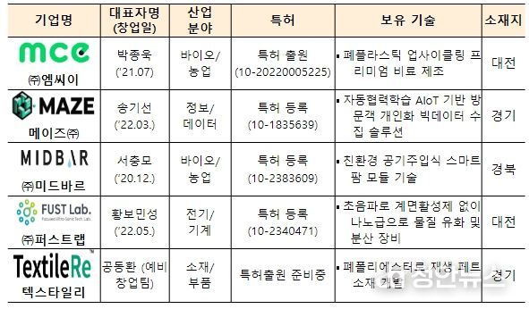 행사에는 폐플라스틱을 새활용(업사이클링해) 프리미엄 비료를 제조하는 ㈜엠씨이, 에이아이오티(AIoT) 기반의 방문객 개인화 거대자료(빅데이터) 수집 해결책을 제공하는 메이즈㈜ 외에 ㈜미드바르, ㈜퍼스트랩, 텍스타일리 등 총 5개 기업이 참가한다.