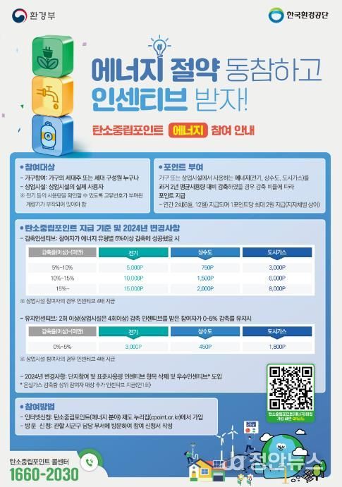 한편 산청군은 탄소중립포인트제 에너지분야(2023년 기준)에 3787세대(23.3%)가 참여하고 있으며 에너지를 절약한 1448세대에 2400여 만원의 인센티브를 지급했다.