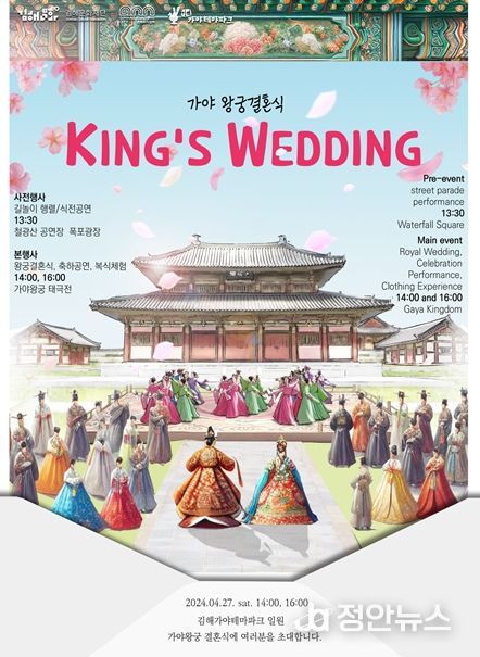 ‘왕궁결혼식’은 오는 4월 27일 오후 2시, 4시 가야테마파크 가야왕궁 일대에서 진행되며 상세 내용은 홈페이지에서 확인 가능하다.
