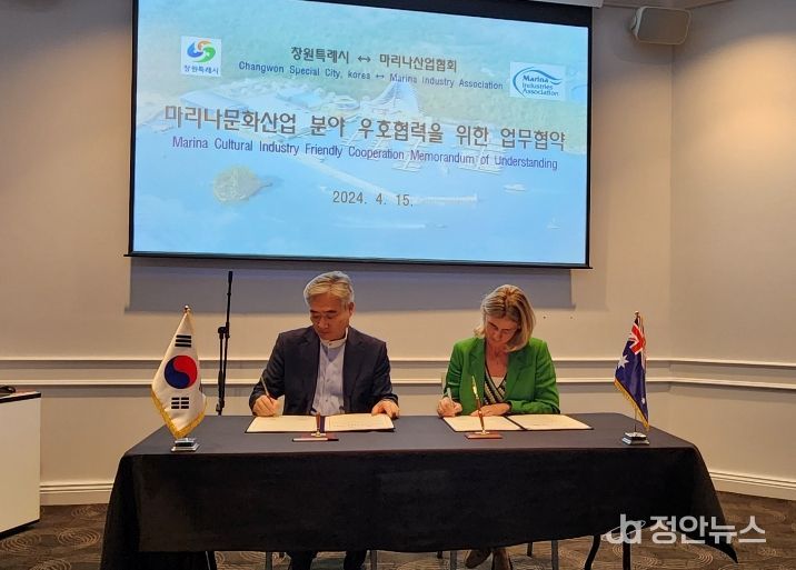 정안뉴스 안정주 기자 | 창원특례시는 지난 15일에 호주 시드니에 위치한 홀리데이 인 포츠포인트 호텔에서 호주 마리나산업협회와 ‘마리나문화산업’ 우호 협약을 맺었다.