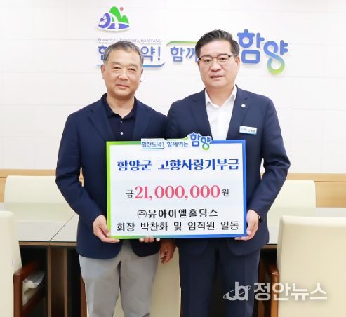 정안뉴스 안정주 기자 | 함양군 향우인 박찬화 ㈜유아이엘홀딩스 회장을 비롯한 임직원 12명이 고향사랑기부제를 통해 함양군에 2,000만 원이 넘는 고액의 기부금을 전달했다.