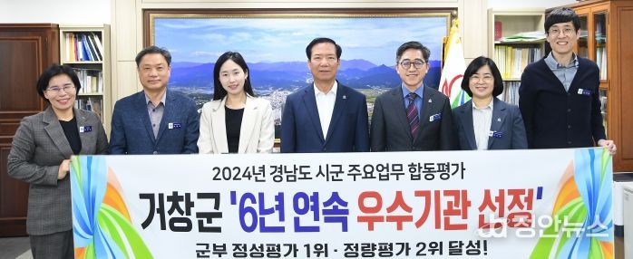 정안뉴스 안정주 기자 | 거창군은 ‘2024년('23년 실적) 시군 주요업무 합동평가’에서 군부 정성평가 1위, 정량평가 2위를 달성하여 6년 연속 우수기관으로 선정됐다고 밝혔다.