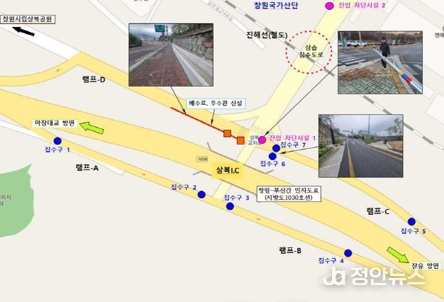 침수 도로의 상부에 있는 마창대교~불모산터널 민자도로인 지방도 1030호선(경남하이웨이 관리) 램프 4개소에 배수로(L=75m)와 집수구(7개소)를 설치하여 상부 구간의 우수를 배제함으로써 하부도로의 우수유입을 사전에 차단했다.