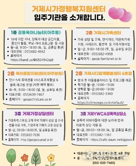 2023년 10월 개원한 거제시 가정행복지원센터는 지하 1층, 지상 4층 규모의 돌봄기능을 중심으로한 생활 SOC복합시설로 여러 기관이 입주해 있다.