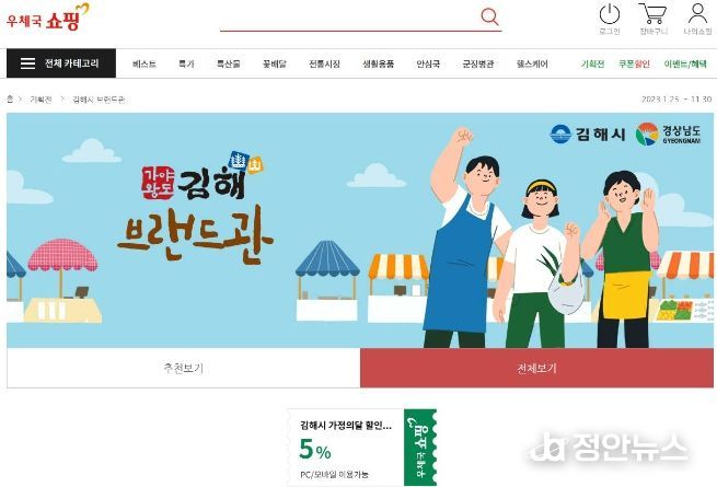정안뉴스 안정주 기자 | 김해시는 5월 가정의 달과 24년 대한민국 동행축제 기간을 맞아 우체국 쇼핑몰 ‘김해시 브랜드관’에서 전 품목 5% 할인쿠폰을 발행하는 ‘가정의 달 선물전’을 진행한다고 17일 밝혔다.