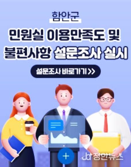 정안뉴스 안정주 기자 | 함안군에서는 오는 6월 28일까지 약 2개월간 ‘민원실 이용만족도 및 불편사항 설문조사’를 실시한다고 17일 밝혔다.