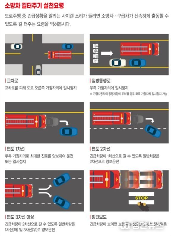 소방차 등 긴급차량을 발견했을 때 올바르게 길 터주는 방법은 ▲(교차로)도로 오른쪽 가장자리에 일시정지 ▲(일방통행로)우측 가장자리에 일시정지 ▲(편도 1차선)우측 가장자리 양보 운전 또는 일시정지 ▲(편도 2차선)일반 차량은 2차선으로 양보운전 ▲(편도 3차선 이상)일반 차량은 1차선 및 3차선으로 양보 ▲(황단보도)횡단보도 앞 잠시 멈춤 등이다.