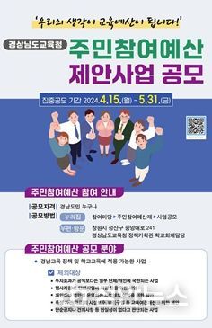 정안뉴스 안정주 기자 | 경상남도교육청은 내년도 예산에 반영할 유익한 교육정책과 재정 사업을 발굴하고자 다음 달 31일까지 주민참여예산 제안사업을 공모한다.
