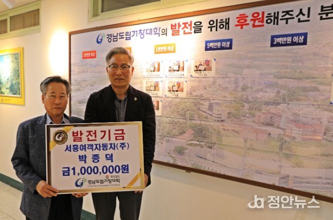 정안뉴스 안정주 기자 | 경남도립거창대학은 16일 거창군 소재 서흥여객자동차(주) 박종덕 대표가 모교인 경남도립거창대학을 방문해 발전기금 100만 원을 전달했다고 밝혔다.