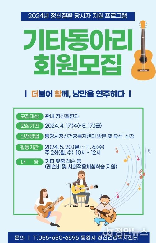 정안뉴스 안정주 기자 | 통영시 정신건강복지센터는 정신질환자를 대상으로 정신질환자의 자립도모와 안정적인 지역사회 복귀를 위해 오는 5월 17일까지 당사자 지원 프로그램 ‘기타동아리’ 회원을 모집한다.