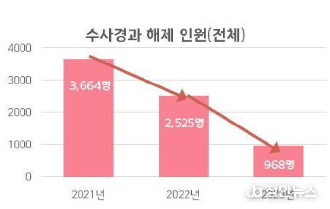 두 번째로, 수사 경과를 포기하는 인원이 대폭 감소하는 등 수사 부서 근무를 희망하는 분위기가 조성되고 있다. 특히, 수사 경과를 수사관이 자진 해제하는 인원수는 2021년 3,096명에서 2023년 654명으로 약 78% 급감했다.