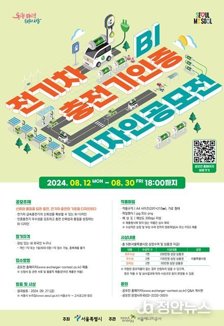 정안뉴스 박상욱 기자 | 서울시는 전기차 급속충전기 관리 인증제 도입을 앞두고 인증된 충전기를 시민 누구나 쉽게 사용할 수 있도록 한눈에 확인 가능한 ‘전기차 충전기 인증 BI 디자인 공모전’을 개최한다고 밝혔다. BI제작에 관심있는 내·외국인 누구나 참여 가능하며 선정된 창의적 아이디어의 디자인은 충전기 인증마크로 적극 활용할 예정이다.