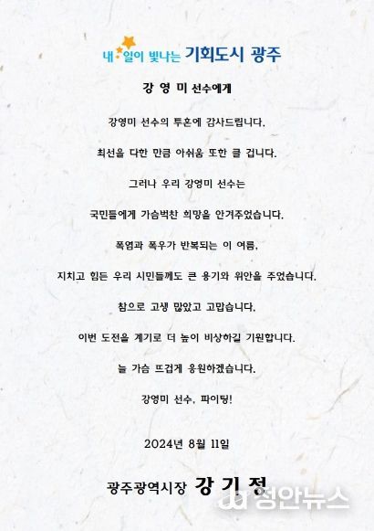 정안뉴스 박상욱 기자 | 강기정 광주광역시장이 제33회 파리올림픽에서 열전을 펼친 전웅태, 강영미, 김재원, 이혜경, 신은철 등 광주시 소속 선수단 5명에게 11일 격려 메시지를 보냈다.