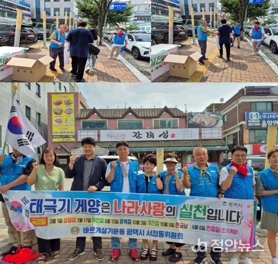 정안뉴스 박상욱 기자 | 평택시 바르게살기운동 서정동위원회는 지난 10일 제79주년 8․15 광복절을 맞아 송탄 관광특구로 일대에서 시민들에게 태극기 200개를 나눠주는 행사를 진행했다.