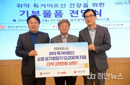 정안뉴스 기자 | 광주광역시는 11일 시청 비즈니스룸에서 ㈜이오니스가 광주지역 홀로 사는 어르신들을 위해 소형 공기청정기 기부물품을 전달했다고 밝혔다.