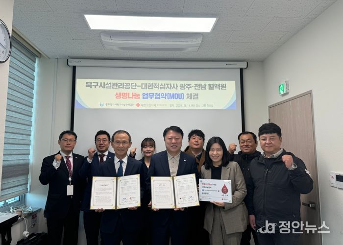정안뉴스 기자 | 광주광역시북구시설관리공단과 대한적십자사 광주·전남혈액원이 지난 11월 14일 광주광역시북구시설관리공단 2층 회의실에서 생명나눔을 위한 업무협약을 체결했다.