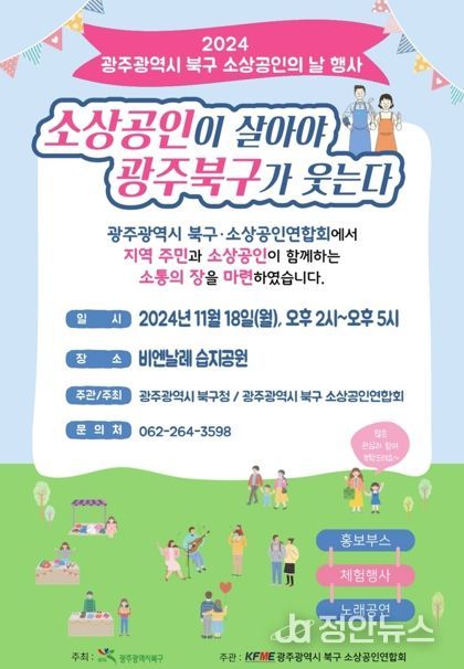 정안뉴스 기자 | 광주시 북구가 오는 18일 오후 2시 용봉초록습지공원에서 ‘소상공인이 살아야 광주 북구가 웃는다’ 주제로 ‘소상공인의 날 행사’를 개최한다고 17일 밝혔다.