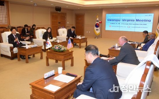강기정 광주광역시장은 18일 오후 시청 비즈니스룸에서 미국 버지니아주 장관 등과 만나 ‘농업 및 푸드테크 분야 협력을 위한 간담회’를 진행했다.