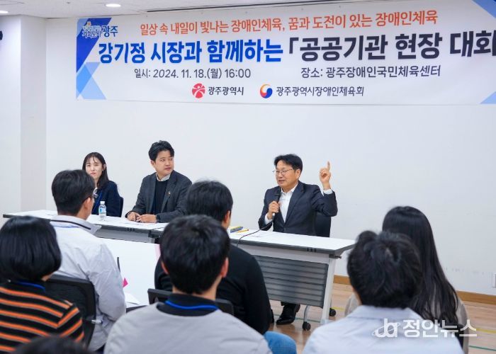 정안뉴스 기자 | 강기정 광주광역시장은 18일 오후 광주광역시장애인체육회와 ‘공공기관 현장대화’를 마련, 장애인체육 활성화에 대해 논의했다. 이날 대화에는 광주시장애인체육회장인 강 시장을 비롯해 한상득 수석부회장, 직원 30여명이 참석했다.
