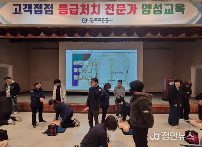 정안뉴스 기자 | 광주교통공사는 20일 광주시 서구 마륵동 본사에서 비상 상황 발생 시 고객 접점 직원들의 대응 능력 강화를 위한‘응급처치 전문가 양성 교육’을 펼쳤다고 밝혔다.