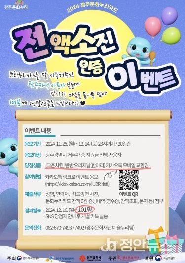 당첨자는 12월 16일 ‘광주문화누리’ 공식 블로그와 인스타그램·카카오톡 채널(광주문화누리카드) 등 사회관계망서비스(SNS)에 공지후 응모자 카카오톡 계정으로 기프티콘을 발송할 예정이다.