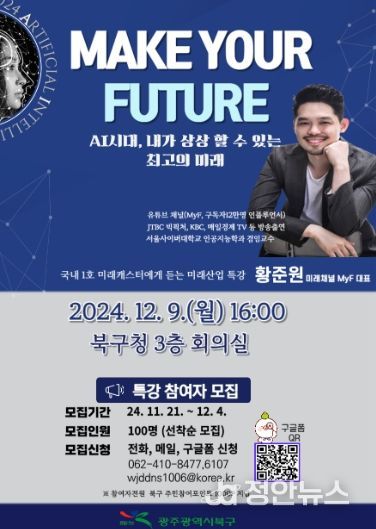 정안뉴스 기자 | 광주시 북구가 미래 변화에 대한 소식을 쉽고 재밌게 전달하는 직업 ‘미래캐스터’를 창직한 황준원 서울사이버대학교 인공지능학과 교수를 초청해 4차 산업혁명 특강을 운영한다.