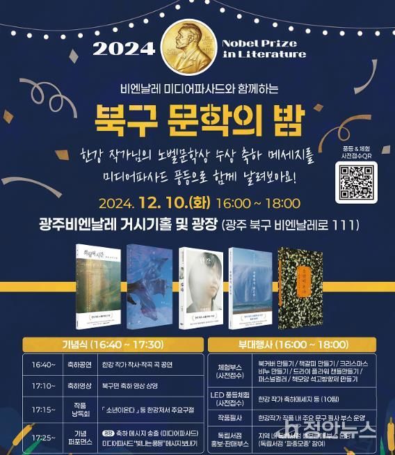 28일 북구에 따르면 다가오는 ‘한강 작가 노벨문학상 시상식’을 기념하여 오는 12월 10일 오후 4시 광주비엔날레 거시기홀과 비엔날레 광장에서 ‘미디어파사드와 함께하는 북구 문학의 밤’ 행사가 개최된다.