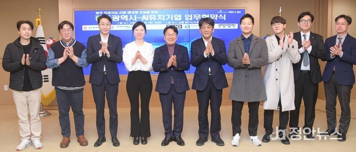 이날 협약식에는 강기정 시장을 비롯해 더블유에이아이 이진행 대표이사, 바이오브레인 김기성 대표이사, 아파유 신승호 대표이사, 앰플랩 김진영 대표이사, 일리오 오태근 대표이사, 토마스톤 이재영 대표이사, 투비유니콘 윤진욱 대표이사, 하마다랩스 이득기 CTO 등이 참석했다.