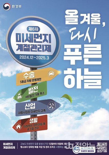 손인규 기후대기정책과장은 “올 겨울 날씨는 평년과 비슷한 기온이 예상되지만, 라니냐 영항으로 기습 한파가 발생할 수도 있다”며 “국내외 기상변화 추이를 관망해 미세먼지로부터 시민 건강을 보호할 수 있도록 제6차 미세먼지 계절관리제 시행에 만전을 기하겠다”고 말했다.