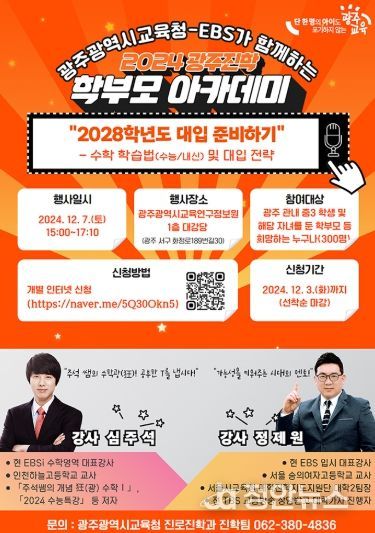 정안뉴스 기자 | 광주시교육청은 오는 7일 오후 3시 광주교육연구정보원 1층 대강당에서 EBS와 공동으로 ‘2024 광주진학 학부모 아카데미 6차 강연’을 개최한다.